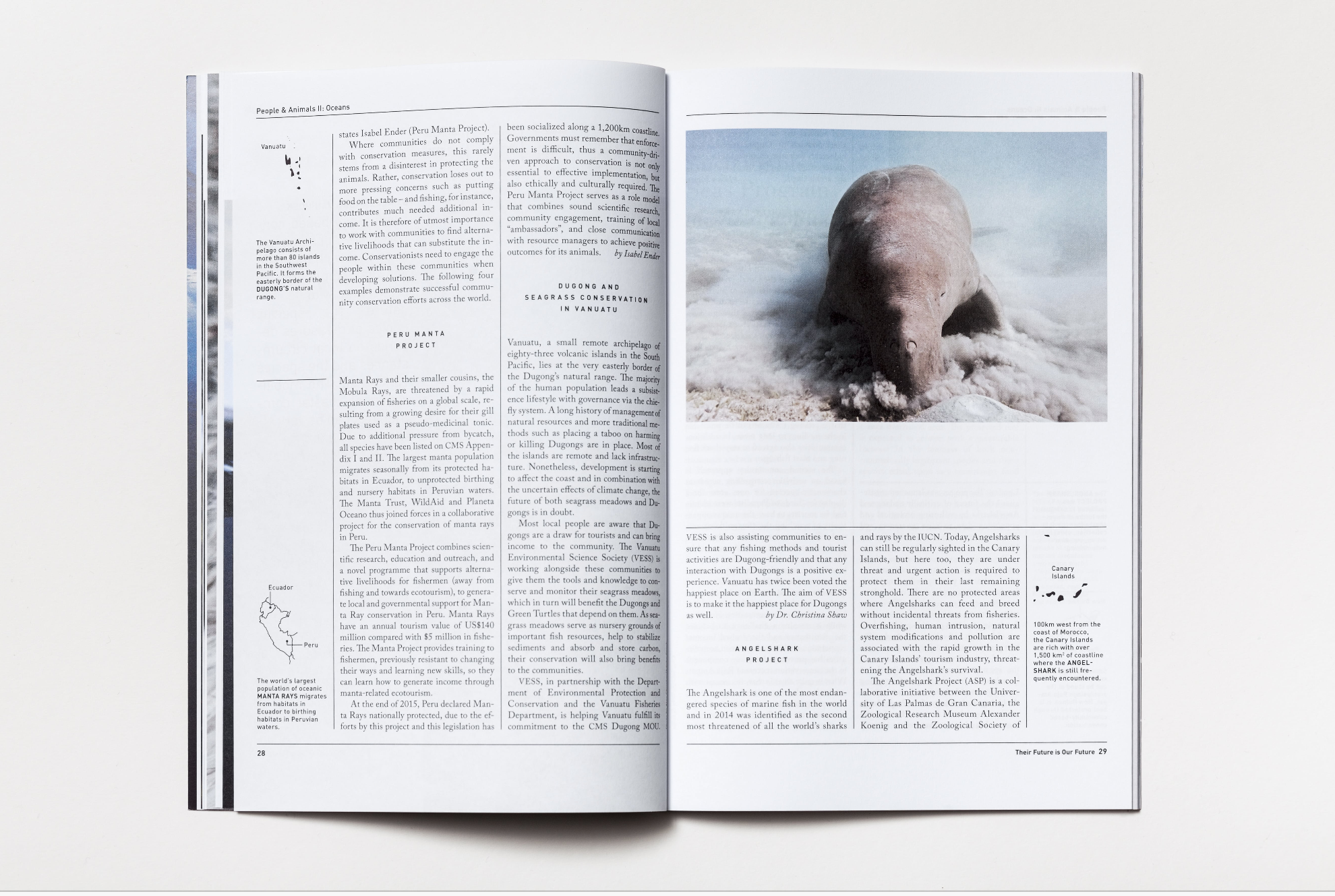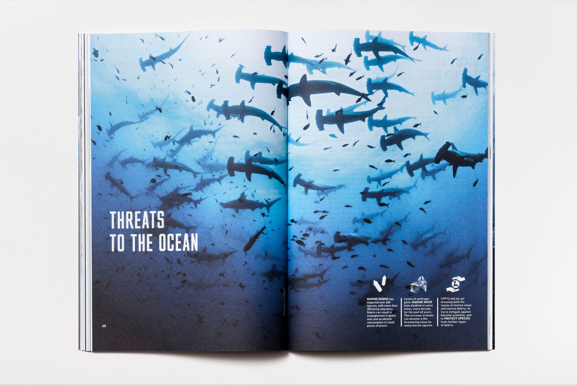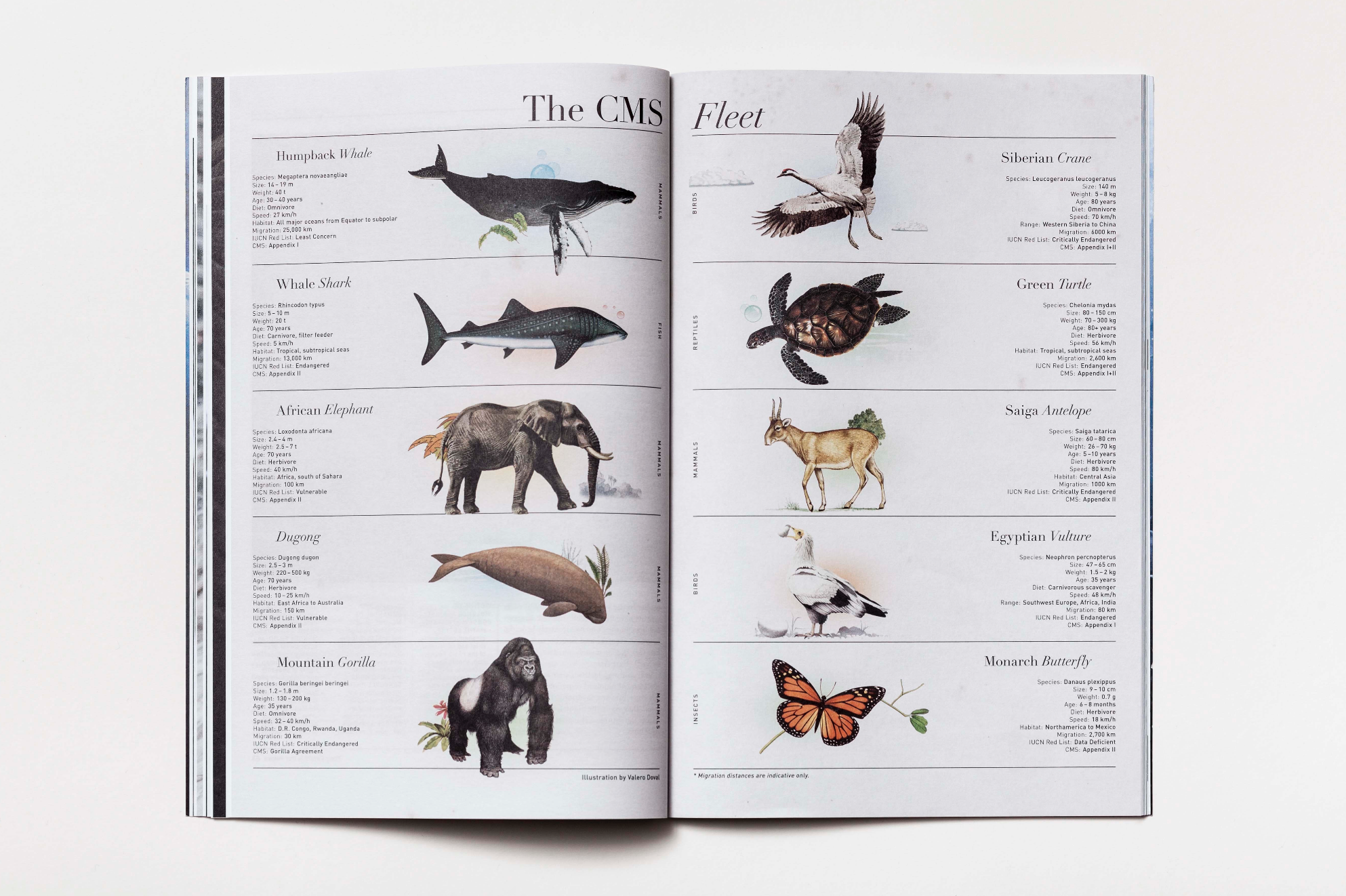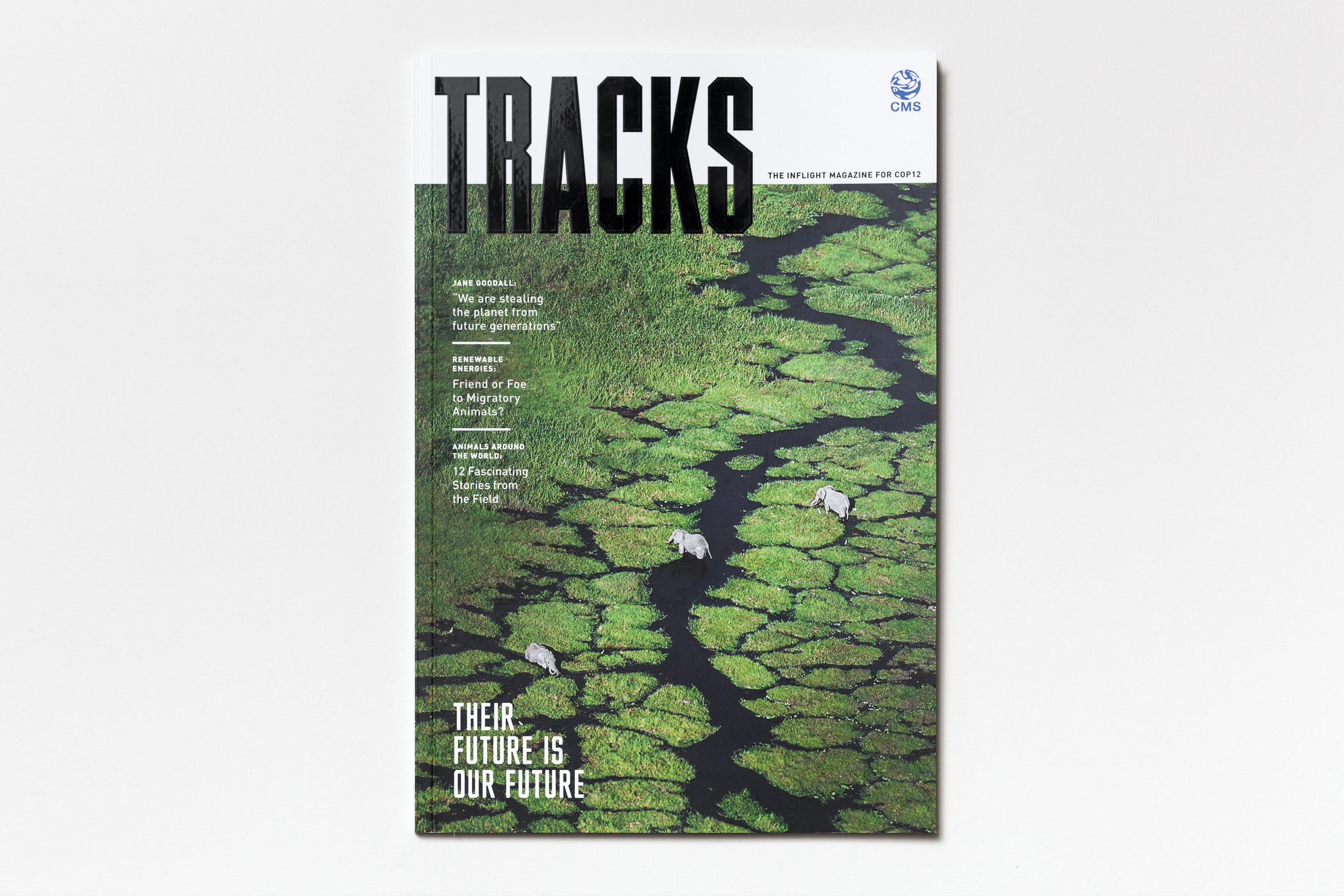 The UNEP Convention on Migratory Species (CMS) is a UN-based, global organization for the conservation and management of migratory species. For the twelfth Conference of the Parties (COP12) in 2017 in Manila/Philippines, I designed and created the magazine TRACKS from scratch, in close collaboration with a small team at CMS in Bonn/Germany. Instead of handing out bland conference papers, the idea was to present the content in a publication that resembles an inflight magazine – because migratory animals are the “frequent travelers“ of the animal kingdom. The concept included double spreads of the “fleet“ and a “route map“ similar to those found in any given inflight magazine.