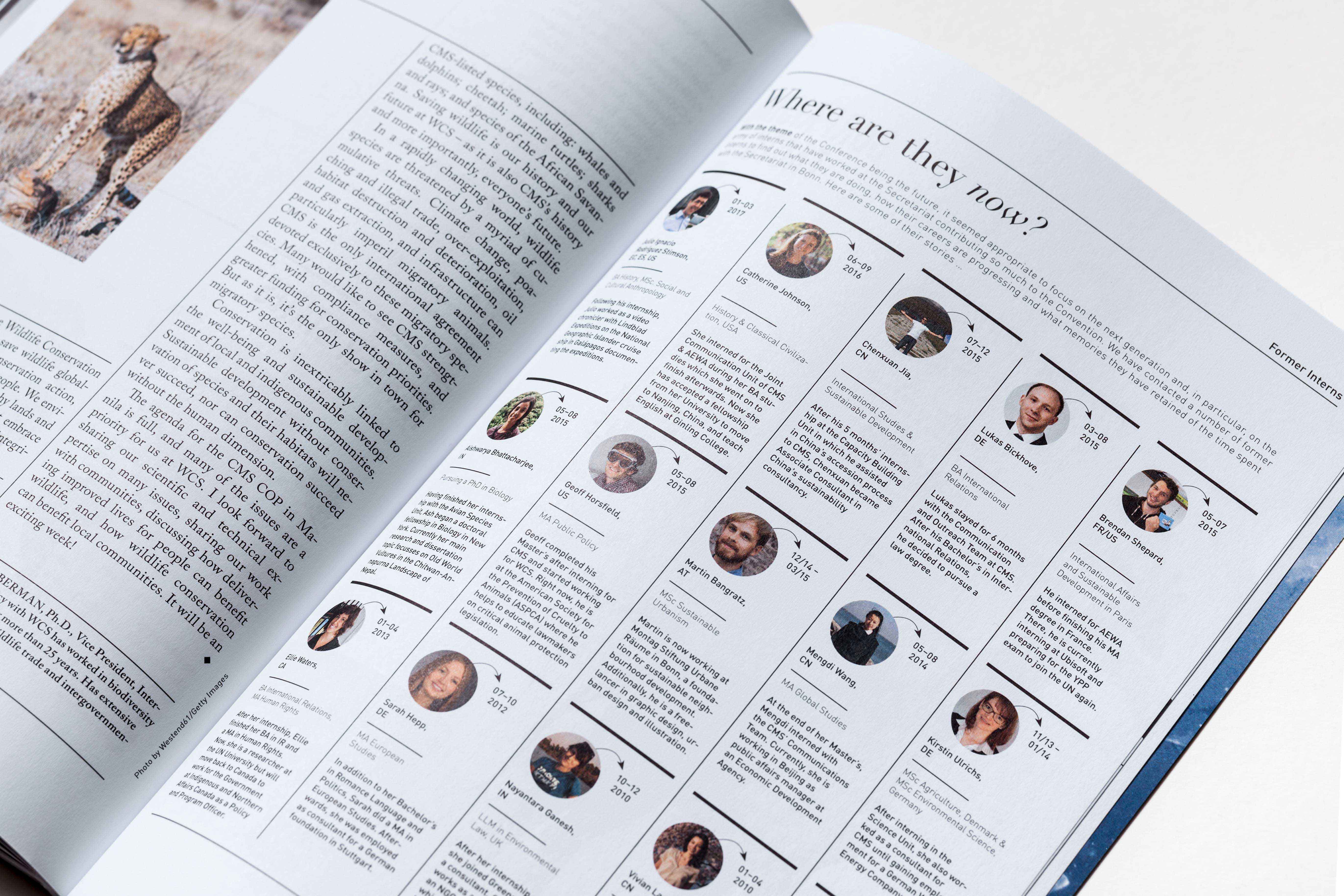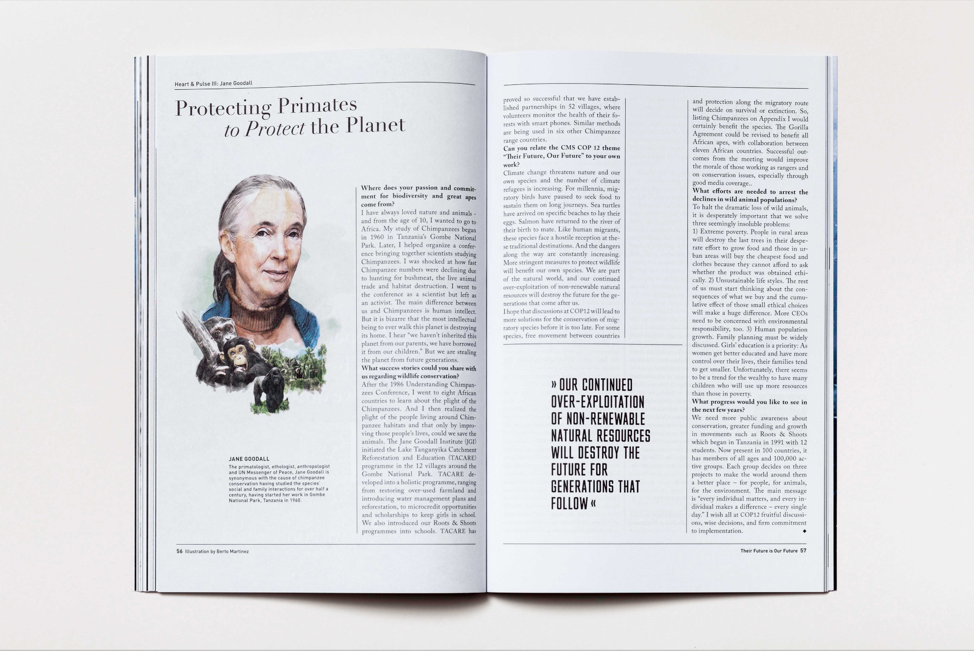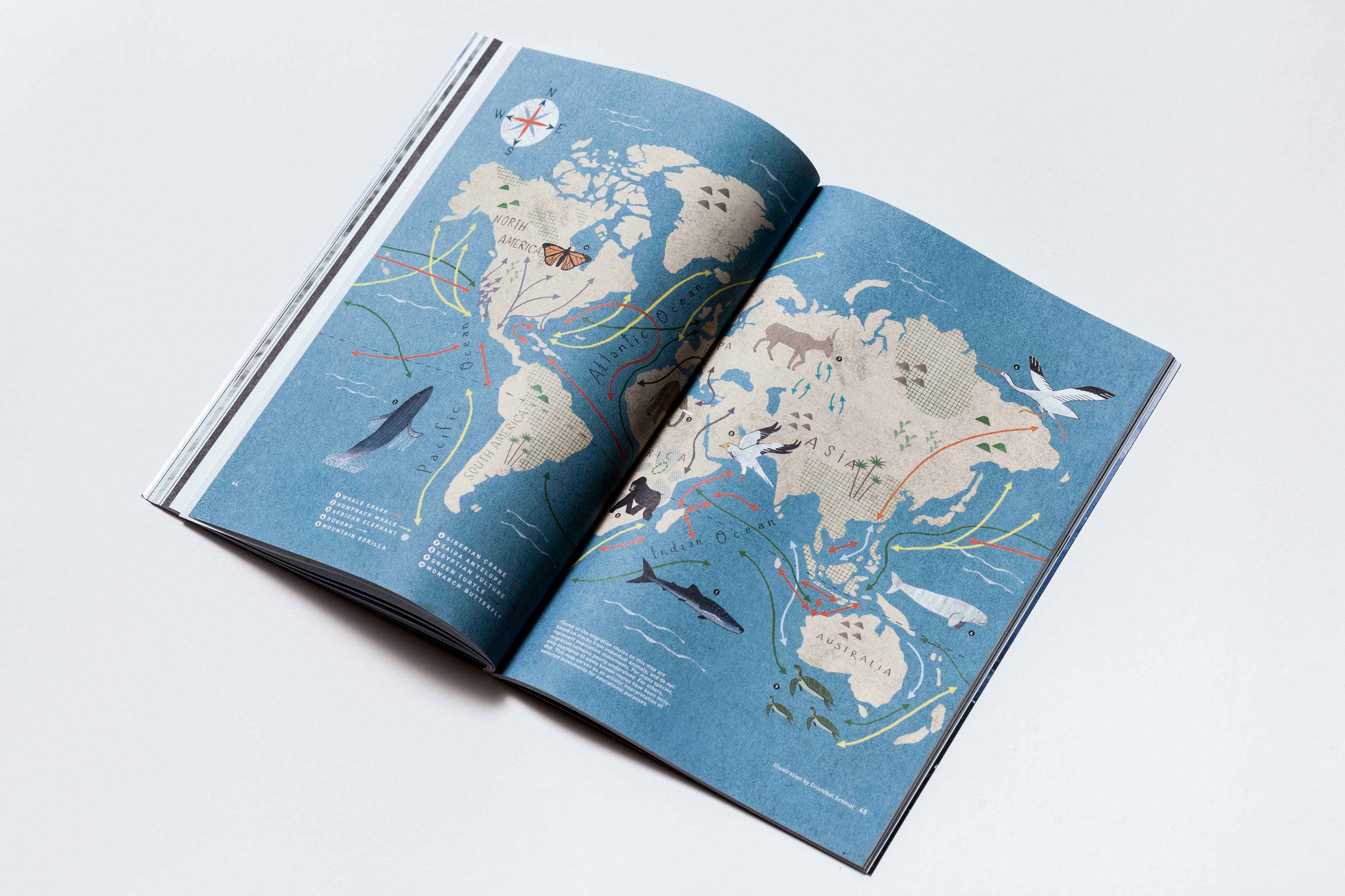 The UNEP Convention on Migratory Species (CMS) is a UN-based, global organization for the conservation and management of migratory species. For the twelfth Conference of the Parties (COP12) in 2017 in Manila/Philippines, I designed and created the magazine TRACKS from scratch, in close collaboration with a small team at CMS in Bonn/Germany. Instead of handing out bland conference papers, the idea was to present the content in a publication that resembles an inflight magazine – because migratory animals are the “frequent travelers“ of the animal kingdom. The concept included double spreads of the “fleet“ and a “route map“ similar to those found in any given inflight magazine.